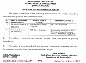 ਫਿਰੋਜ਼ਪੁਰ — ਪੰਜਾਬ ਸਰਕਾਰ ਨੇ ਫਿਰੋਜ਼ਪੁਰ ਰੇਂਜ ਦੇ ਡੀਆਈਜੀ ਹਰਮਨਬੀਰ ਗਿੱਲ ਨੂੰ ਹਟਾ ਦਿੱਤਾ ਹੈ। ਉਨ੍ਹਾਂ ਨੂੰ ਹੁਣ ਪੀਏਪੀ ਜਲੰਧਰ ਵਿੱਚ ਤਾਇਨਾਤ ਕੀਤਾ ਗਿਆ ਹੈ। ਉਨ੍ਹਾਂ ਦੀ ਜਗ੍ਹਾ ਲੁਧਿਆਣਾ ਕਮਿਸ਼ਨਰੇਟ ਵਿੱਚ ਤਾਇਨਾਤ ਡੀਸੀਪੀ ਸਨੇਹਦੀਪ ਸ਼ਰਮਾ ਨੂੰ ਫਿਰੋਜ਼ਪੁਰ ਰੇਂਜ ਦਾ ਨਵਾਂ ਡੀਆਈਜੀ ਨਿਯੁਕਤ ਕੀਤਾ ਗਿਆ ਹੈ। ਇਸ ਸਰਕਾਰੀ ਫੈਸਲੇ ਦਾ ਕਾਰਨ ਸਾਹਮਣੇ ਨਹੀਂ ਆਇਆ ਹੈ।