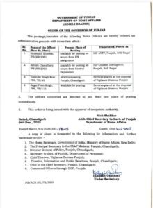 ਚੰਡੀਗੜ੍ਹ —— ਪੰਜਾਬ ਸਰਕਾਰ ਵੱਲੋਂ 4 IPS/PPS ਅਫਸਰਾਂ ਦਾ ਤਬਾਦਲਾ ਕੀਤਾ ਗਿਆ ਹੈ। ਜਿਨ੍ਹਾਂ ‘ਚ 2 IPS ਅਤੇ 2 PPS ਅਫਸਰ ਹਨ। ਪੂਰੀ ਸੂਚੀ ਹੇਠਾਂ ਦੇਖੋ…..